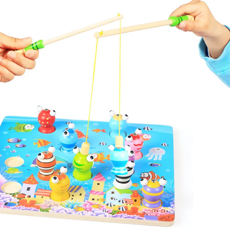 Wood Colorful Fishing Game Kids Wooden Toys Magnetic Games Fishing Toy Kids 3D Fish Baby Kids Educational Toys Gifts